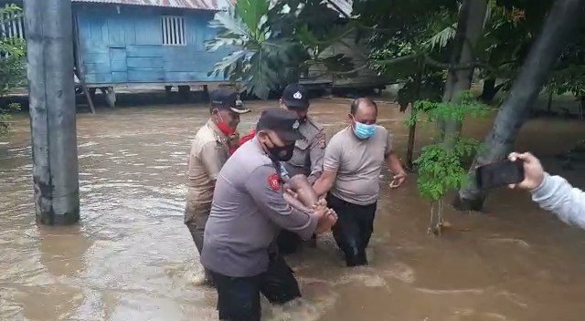 Banjir juga membanjiri perkarangan beberapa rumah warga. Seorang lansia terpaksa dievakuasi oleh polisi dan warga setempat.