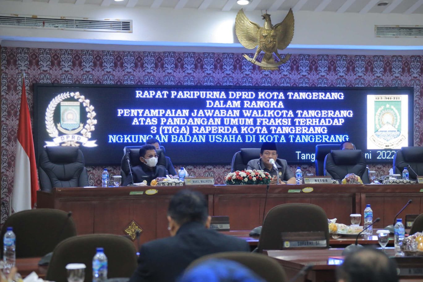 Adapun tiga Raperda tersebut tentang Pertanggungjawaban Pelaksanaan Anggaran Pendapatan dan Belanja TA 2021, Rancangan Perubahan atas Peraturan Daerah Nomor 5 Tahun 2017 tentang Penyerahan Prasarana, Sarana dan Utilitas Perumahan, dan Rancangan tentang Tanggung Jawab Sosial dan Lingkungan Badan Usaha di Kota Tangerang.