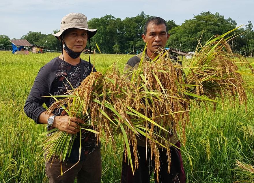 Dalam pemantauan perkembangan panen padi di Desa Tanjung Raya Jul Akmal memberikan fotifasi kepada sejumlah warga yang sedang melakukan panen padi di lokasi persawahan Di Desa Tanjung Raya