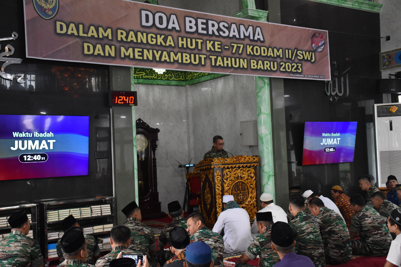 NASIONALXPOS.CO.ID, PALEMBANG – Keluarga besar Kodam II/Sriwijaya menggelar Do’a Bersama dalam rangka menyambut HUT Ke-77 yang jatuh pada tanggal 1 Januari 2023 dan Tahun Baru 2023 mendatang. Do’a Bersama tersebut, dilaksanakan, usai Sholat Jum’at, (30/12/2022) di Masjid Raudhatul ‘Ulum Markas Kodam II Sriwijaya, Palembang.