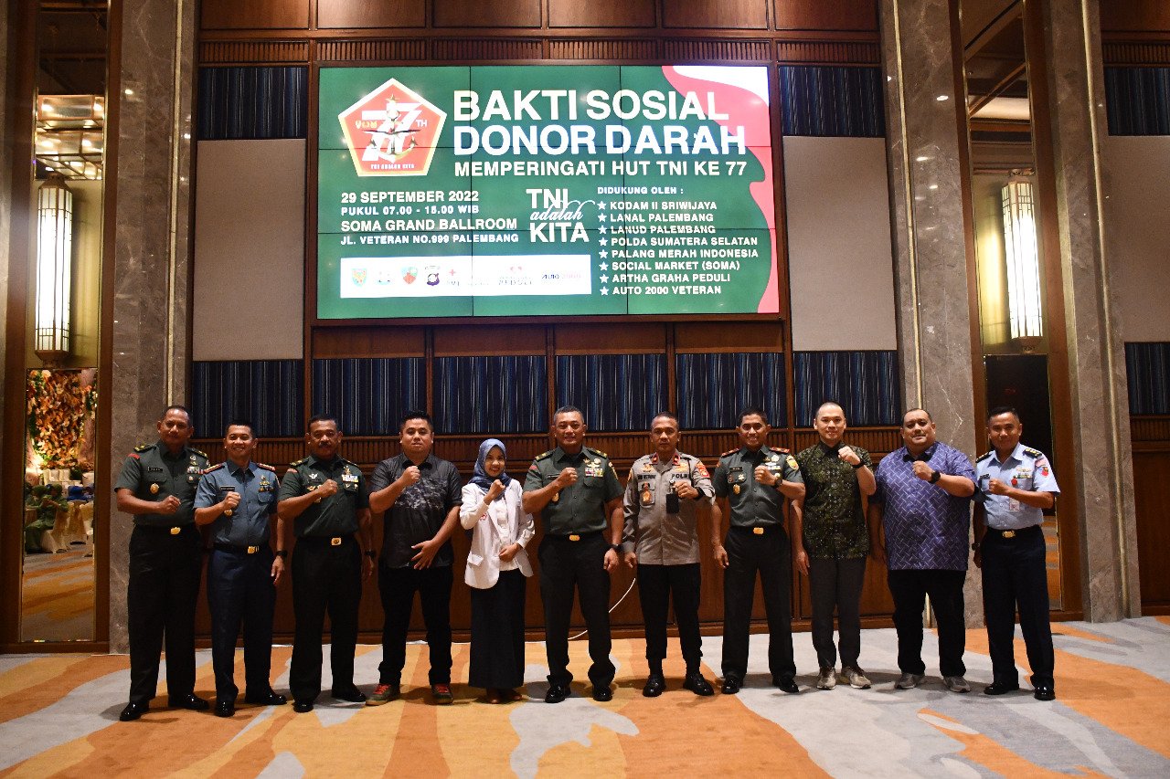 NASIONALXPOS.CO.ID, PALEMBANG – Kodam II/Sriwijaya, Korem 044/Gapo, Lanal dan Lanud Palembang menggelar kegiatan Bakti Sosial (Baksos) Donor Darah di Soma Grand Ballroom, Jalan Veteran No.999, Kuto Batu, Kecamatan Ilir Timur II Kota Palembang, Kamis (29/9/2022).