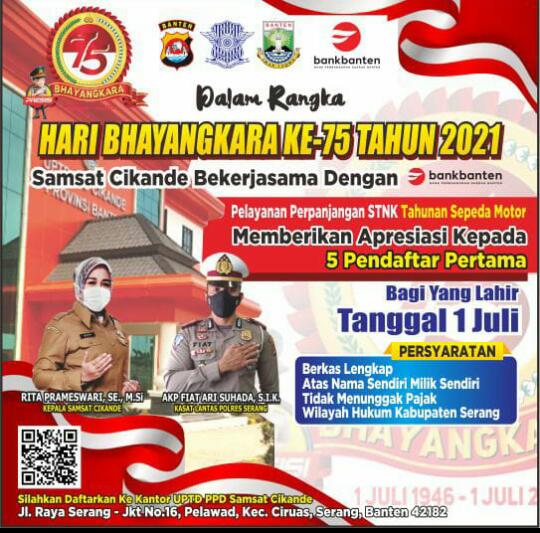 “Dalam rangka Hut Bhayangkara ke-75 Samsat cikande memberikan apresiasi kepada 5 Wajib Pajak kendaraan roda 2 dengan syarat wajib pajak yang tanggal Lahirnya tepat di 1 juli,” Kata Rita
