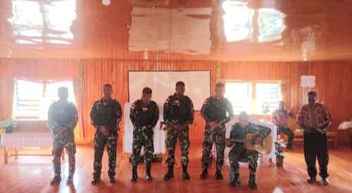 Dalam ibadah yang dipimpin oleh Gembala gereja yaitu Bapak Liwes Wonda tersebut, anggota satgas juga turut menyumbangkan beberapa lagu rohani untuk jemaat di gereja. Berbekal alat musik gitar, Serda Desman dan 5 orang anggota Pos Puncak Senyum lainnya melantunkan nyanyian puji-pujian kepada Tuhan Yesus Kristus. Nampak jemaat mengapresiasi dengan memberikan tepuk tangan sesaat anggota satgas selesai membawakan lagu.
