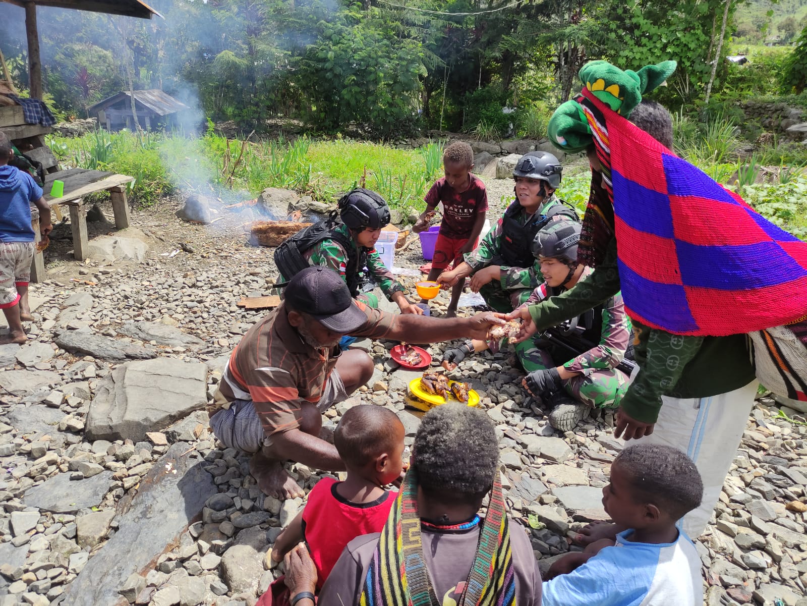 Kali ini Satgas Wiratama Posramil Kota Baru, dibawah pimpinan Letda Inf M. Agung mengunjungi Kp. Wiringame, Distrik Pagaleme dan bertemu dengan Bapak Bimber Telenggen selaku Kepala Suku setempat, sambil membawa ayam mentah untuk di bakar dan disantap bersama-sama.