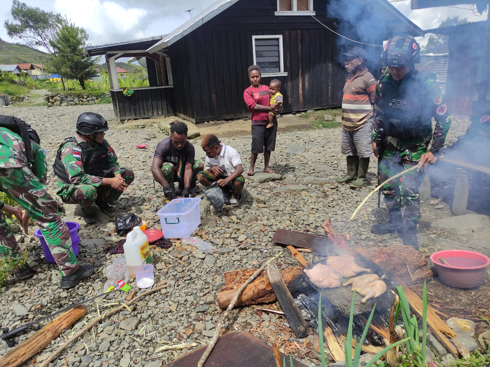 Kali ini Satgas Wiratama Posramil Kota Baru, dibawah pimpinan Letda Inf M. Agung mengunjungi Kp. Wiringame, Distrik Pagaleme dan bertemu dengan Bapak Bimber Telenggen selaku Kepala Suku setempat, sambil membawa ayam mentah untuk di bakar dan disantap bersama-sama.