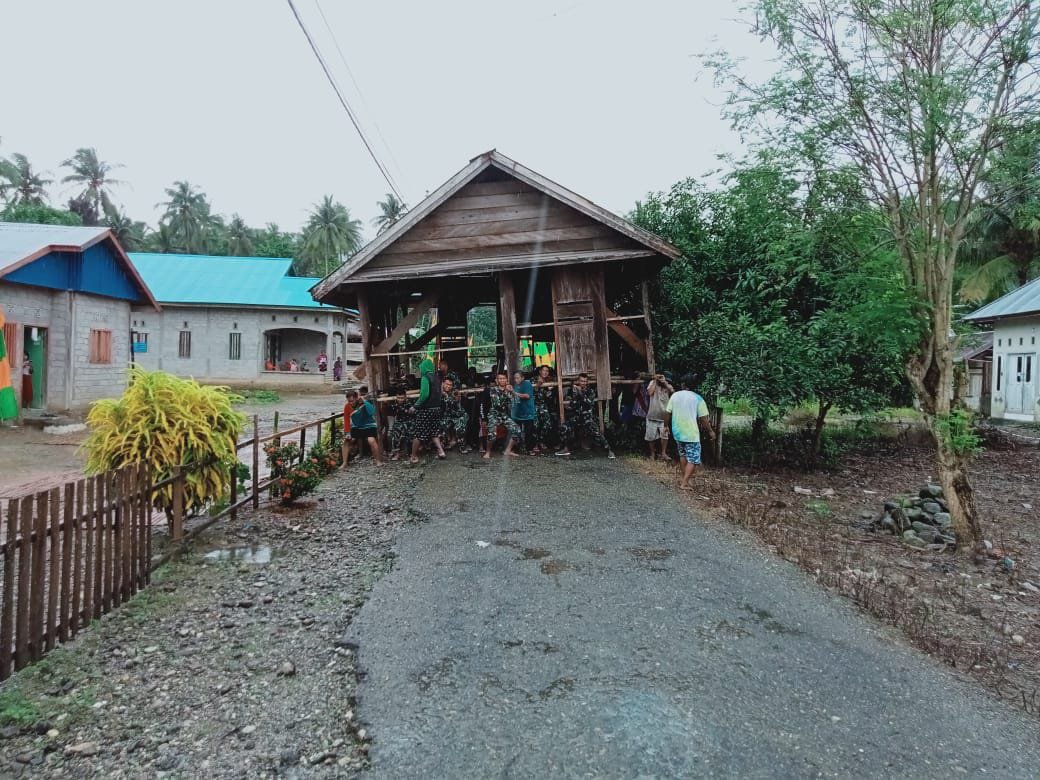 NASIONALXPOS,CO.ID, PALU – Satgas TMMD 114 Kodim 1306/Kota Palu, membantu warga Desa Katulistiwa, Kecamatan Tinombo Selatan dalam prosesi adat pindah rumah, Minggu (07/08/2022).