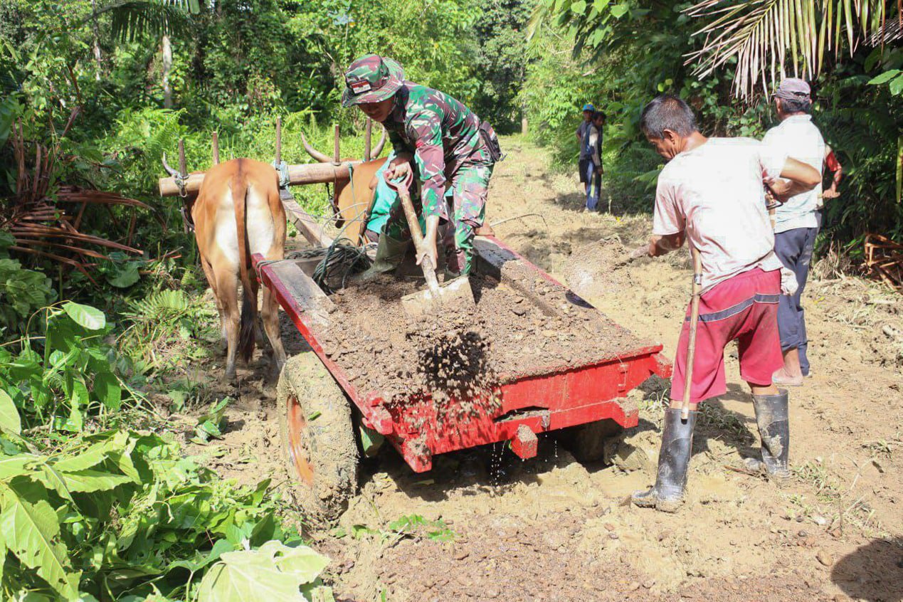 “Di sana, para aggota Satgas beserta warga mengangkut pasir dan batu yang diambil dari sungai terdekat dengan menggunakan gerobak sapi. Hal tersebut dilaksanakan guna memperingan pekerjaan,” urai Sitorus.