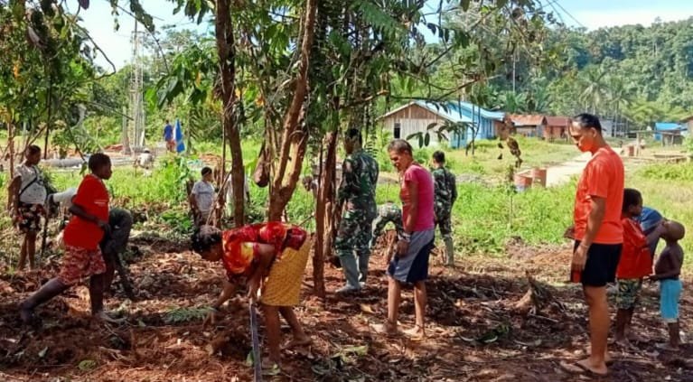 “Dengan segala keterbatasan yang ada kami telah perintahkan anggota Satgas membantu masyarakat Kampung tersebut, seperti saat ini membuka lahan guna dijadikan jalan menuju jalur Sungai,” ungkapnya.