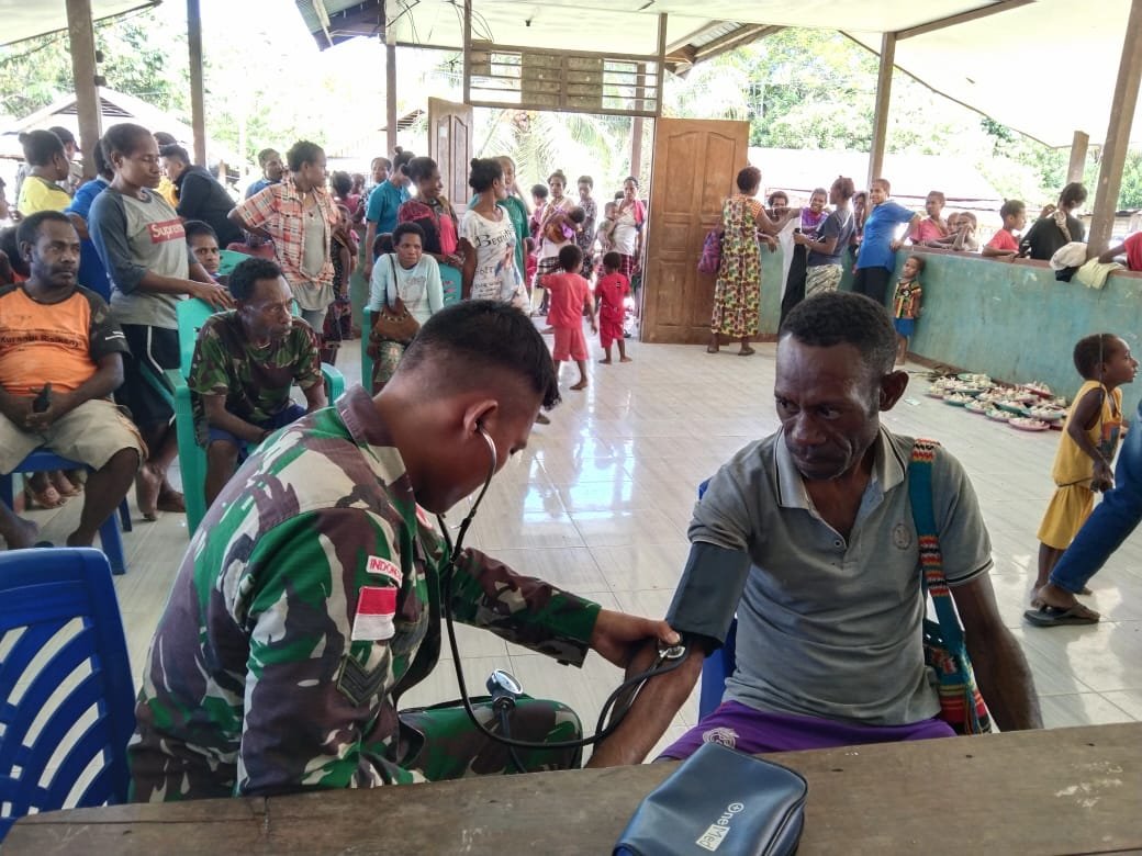 NASIONALXPOS.CO.ID, PAPUA – Dengan menggandeng dinas kesehatan kabupaten keerom Satgas Yonif 143/TWEJ Pos Yabanda menggelar pengobatan masal secara gratis di Kampung Yabanda, Distrik Yaffi Kabupaten Keerom Papua, Selasa (30/05/2023).