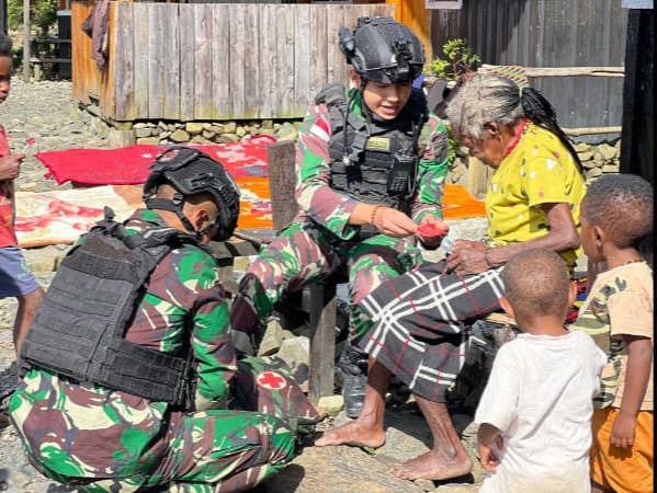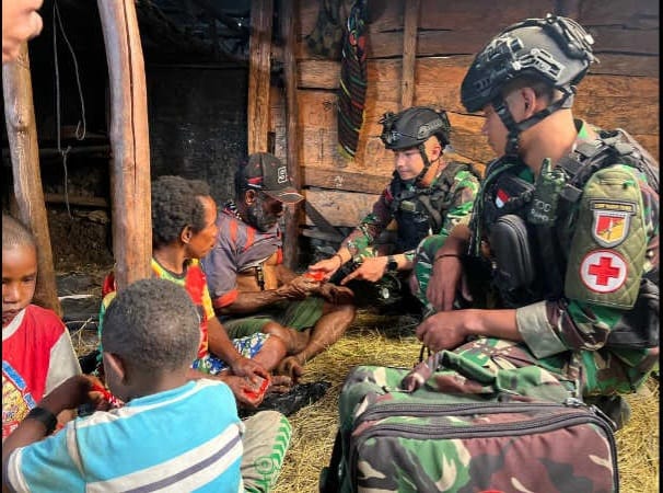 Berbekalkan peralatan kesehatan sederhana dan satu tas medis berisikan obat-obatan, prajurit satgas dengan sigap dan telaten melayani masyarakat yang membutuhkan penanganan medis di kampung-kampung pedalaman Papua.