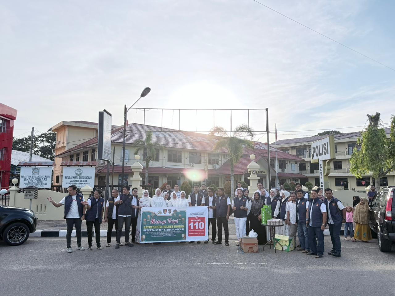 Kegiatan yang dimulai sekitar pukul 16.30 WIB itu dipusatkan di depan Mapolres Bungo. Sejumlah personel Satreskrim tampak turun langsung ke jalan membagikan paket takjil kepada pengendara dan warga yang melintas menjelang waktu berbuka puasa.