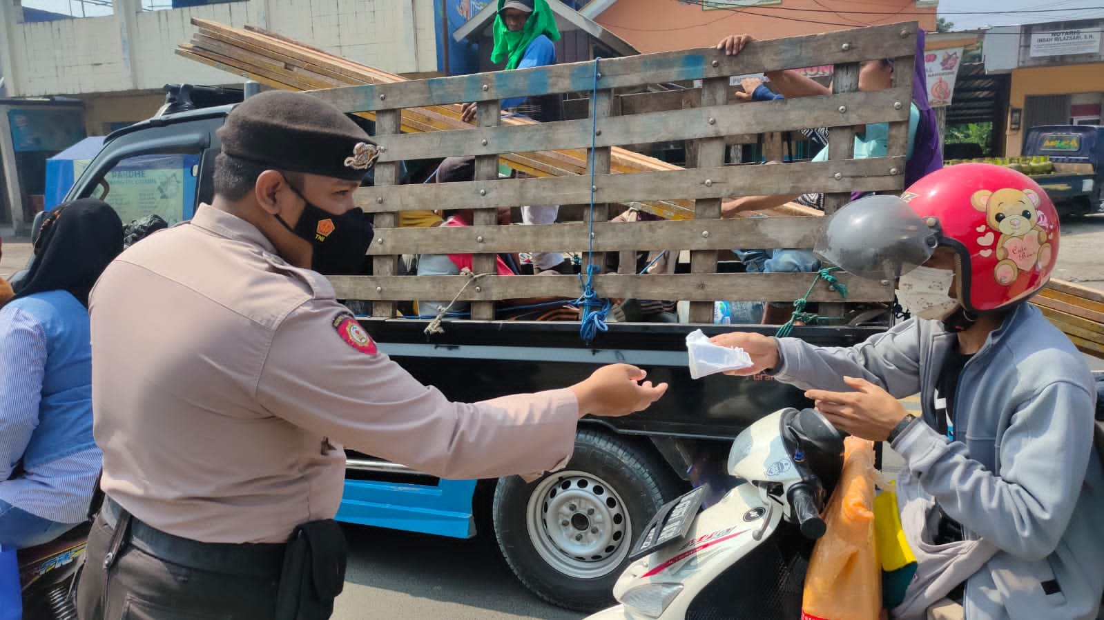 Lanjut AKP Dadang, selain memberikan himbauan Kepada masyarakat, maupun Pengguna jalan baik R2 maupun R4 agar tetap mematuhi Protokol Kesehatan dan mematuhi instruksi mendagri no 39 tahun 2021, tentang PPKM Level 3 covid-19, pihaknya juga membagikan masker secara gratis kepada masyarakat.