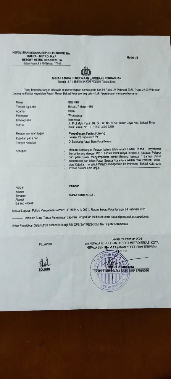 NASIONALXPOS.CO.ID, KOTA BEKASI – Ahli waris tanah pasar Nusantara, Kelurahan Duren Jaya, Kecamatan Bekasi Timur Kota Bekasi, meminta agar polisi segera menindak Ba’ay Suhendra, terduga pelaku penyebar berita bohong atau hoax hingga membuat resah dan tidak nyaman, sebelum kembali berulah dan semakin menimbulkan kekhawatiran dikalangan para pedagang di pasar tersebut.