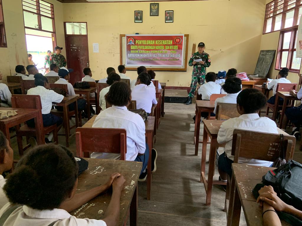 NASIONALXPOS.CO.ID, PAPUA – Sebagai bentuk rasa sayang kepada generasi muda di Perbatasan RI-PNG, Satgas Yonif 143/TWEJ memberikan penyuluhan tentang bahaya penyalahgunaan Narkoba dan HIV AIDS kepada para siswa SMPN 1 Web di Kampung Umuaf, Distrik Web, Kabupaten Keerom, Papua, Rabu (3/04/2023).