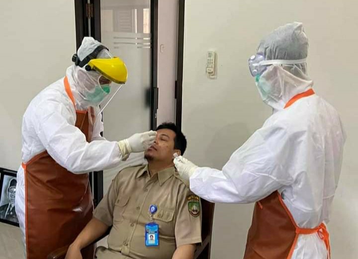 Tes Swab atau pengambilan sampel lendir dilakukan di salah satu ruangan gedung DPRD, oleh empat tenaga kesehatan, yang dipimpin oleh kepala Laboratorium Kesehatan Kabupaten Blora, Sri Purminingsih.