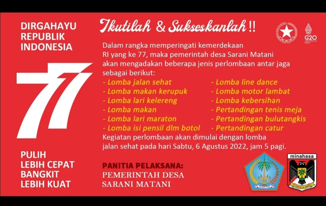 NASIONAL XPOS.CO.ID MINAHASA – Dalam rangka menyambut HUT Kemerdekaan RI ke 77 tahun 2022, Desa Sarani Matani semarakkan dengan menggelar lomba Rekreasi budaya masyarakat, mulai dari tanggal 6 – 16 Agustus 2022. dan hari ini di kegiatan lomba dan pertandingan di buka Oleh Hukum Tua Desa Sarani Matani George Palandi.Sabtu ( 6/8/2022).