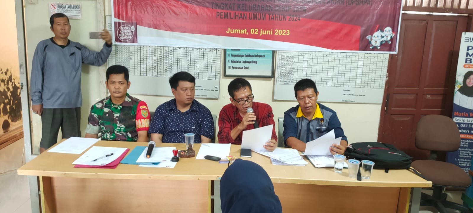 NASIONALXPOS.CO.ID, PALEMBANG – Babinsa Kelurahan Sekip Jaya Koramil 418-06/Kamboja Sertu Damiri Yanto, melaksanakan monitoring kegiatan Rapat Pleno Terbuka DPSHP Akhir Kelurahan Seki Jaya Tahun 2023 untuk Pemilu Tahun 2024.