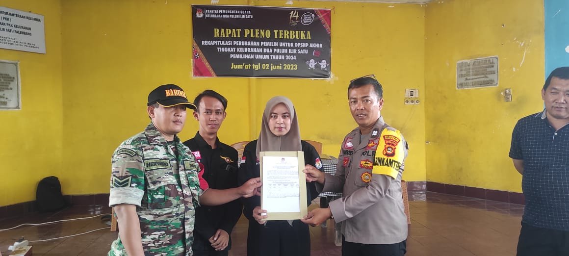 NASIONALXPOS.CO.ID, PALEMBANG – Babinsa Kelurahan 20 Ilir D1 Koramil 418-06/Kamboja Sertu Hariyanto, menghadiri kegiatan Rapat Pleno Terbuka Rekapitulasi Perubahan Pemilih Untuk DPSHP Akhir, Jum’at (2/6/2022).