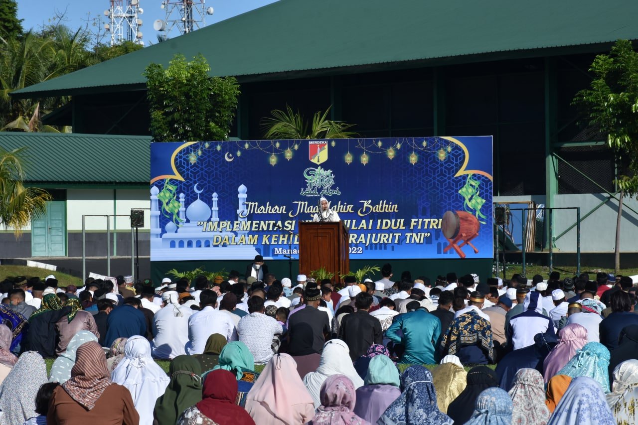 NASIONALXPOS.CO.ID, MANADO – Sebagai bentuk kemanunggalan TNI dengan Rakyat khususnya prajurit Kodam XIII/Merdeka dengan masyarakat sekitarnya yaitu dengan menyediakan tempat bagi umat Islam untuk menunaikan sholat Idul Fitri 1443 Hijriah yang dilaksanakan di lapangan Makodam XIII/Merdeka.