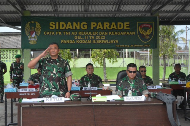 NASIONALXPOS.CO.ID, PALEMBANG – Kepala Staf Kodam II/Sriwijaya Brigjen TNI Izak Pangemanan Memimpin Sidang Pantukhir Calon Tamtama (Cata) Prajurit Karier (PK) TNI AD Reguler dan Keagamaan Gelombang – II TA. 2022 Tingkat Panitia Daerah (Panda) Kodam II/Swj, Selasa (25/10/2022) di Lapangan Apel Markas Ajendam II/Swj Sekojo Palembang.