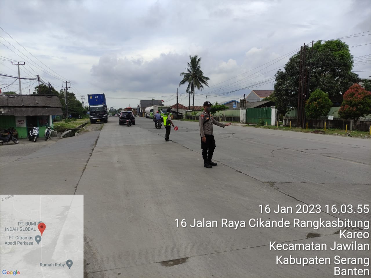 point sore, Bhabinkamtibmas Polsek Jawilan Bripka Sigit dan Bripka Jaenal memberikan pelayanan kepada masyarakat di depan pintu utama kawasan industri Buditexindo Jalan raya Cikande rangkasbitung desa Kareo kecamatan Jawilan.