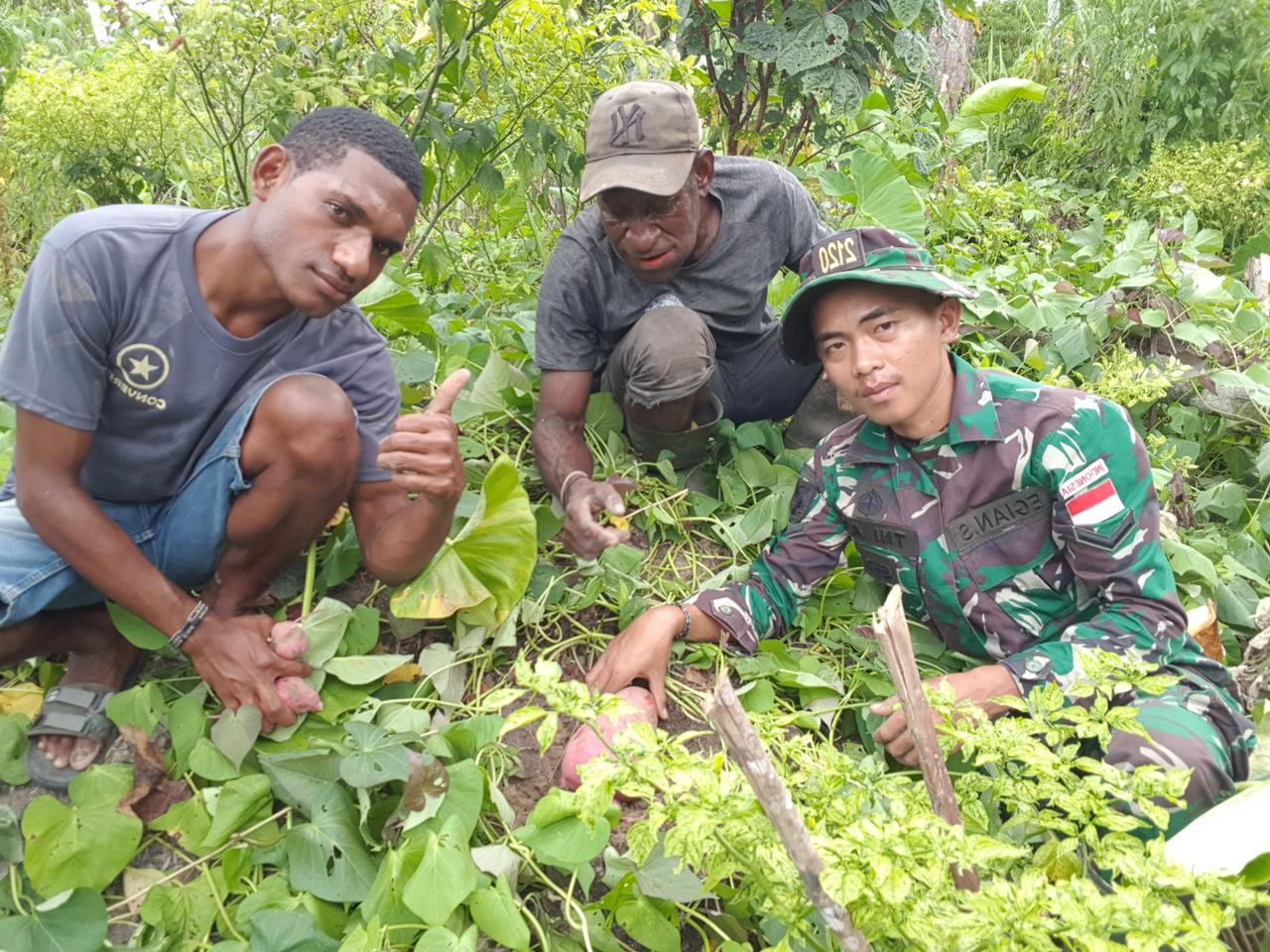 Seperti yang dilakukan oleh Danpos Bompay Satgas Yonif 143/TWEJ, Serka Iwan Syahroni dalam membantu Alex We (49) warga Kampung Bombay pada saat membuka lahan dan menanam tanaman pangan berupa, umbi-umbian untuk persediaan makanan dan apabila hasil panen berlebih dapat di jual untuk meningkatkan perekonomian warga.