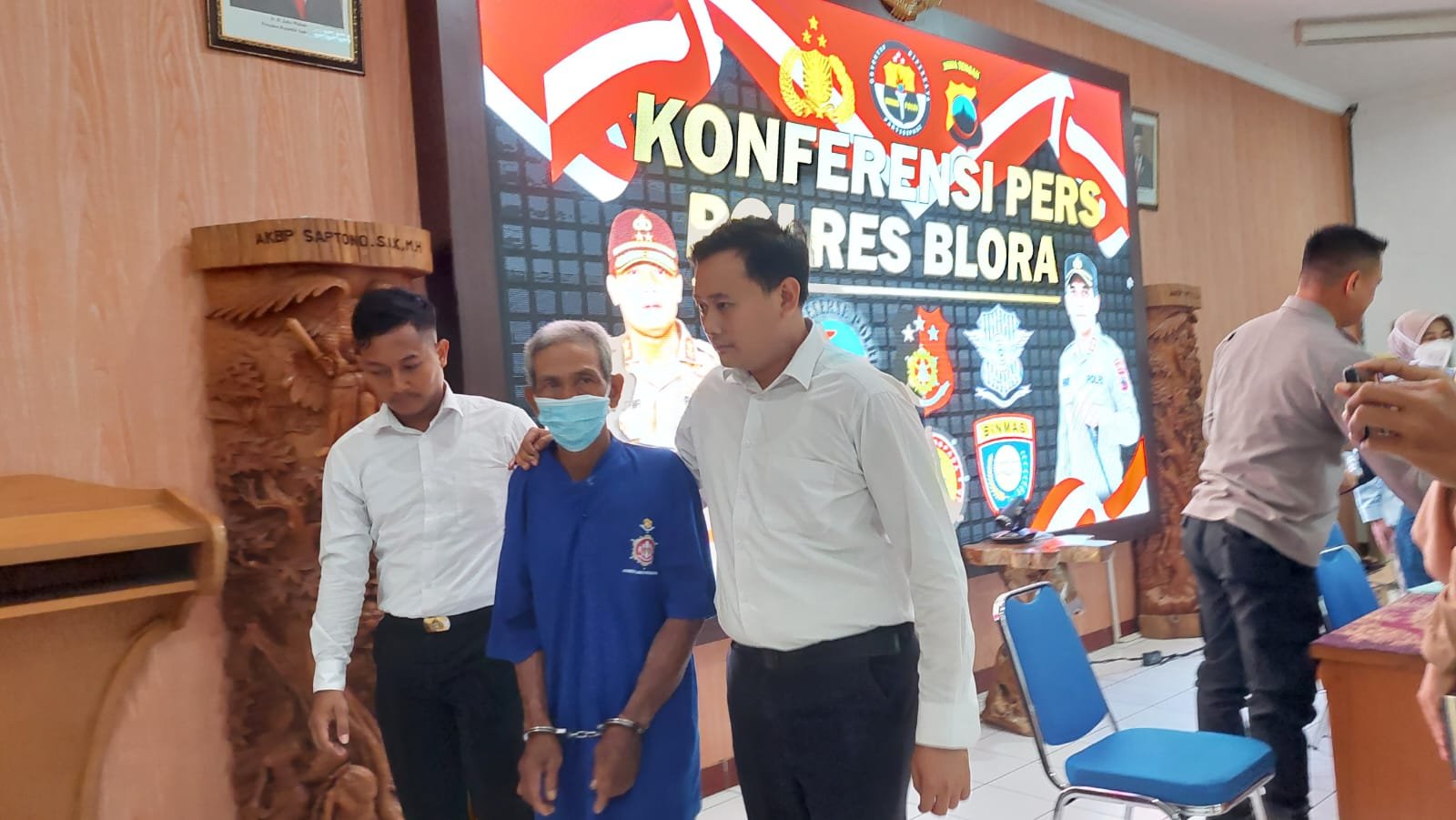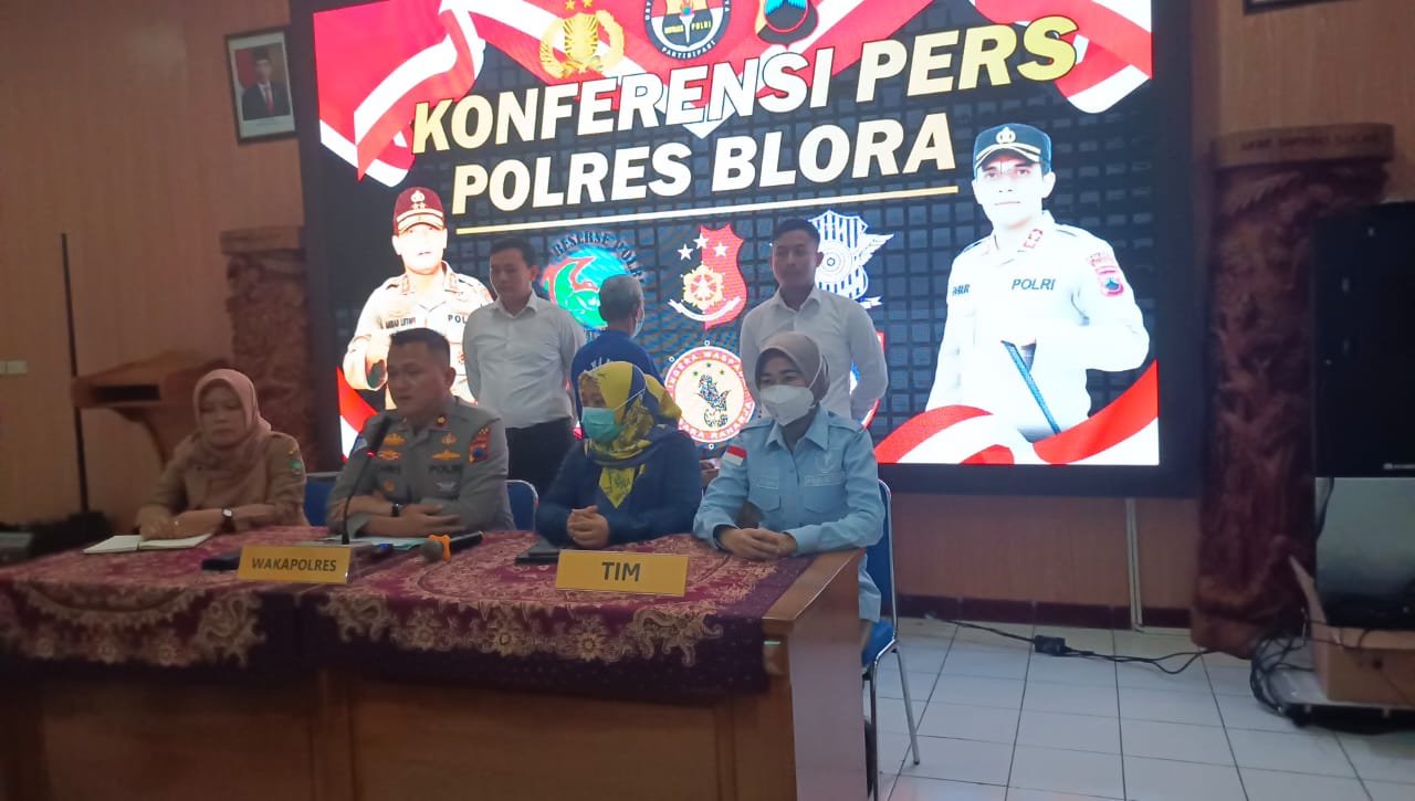 Kapolres Blora AKBP Fahrurozi melalui Wakapolres Kompol Christian Chrisye Lolowang dengan didampingi perwakilan Dinas Sosial Kabupaten Blora, Tim Biddokes Polda Jawa Tengah dan Kasat Reskrim Polres Blora AKP Supriyono saat menggelar konferensi pers di Aula Arya Guna Polres Blora, Senin, (16/01/2023) siang.