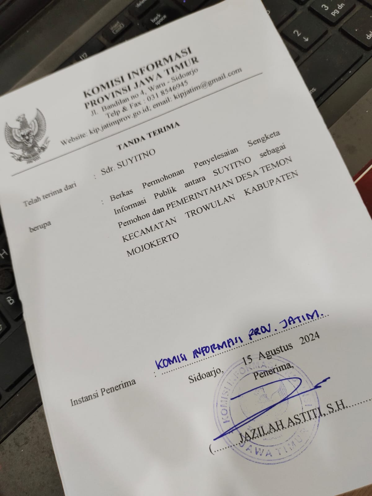 “Bersama pak Suyitno, kami resmi mengajukan permohonan penyelesaian sengketa informasi melawan Pemdes Temon ke Komisi Informasi Provinsi Jawa Timur. Alhamdulillah berkas permohonan kami diterima oleh Jazilah Astiti, S.H., Ini dibuktikan dengan adanya tanda terima,” ungkap Hadi Purwanto. Jum’at (16/08/2024).