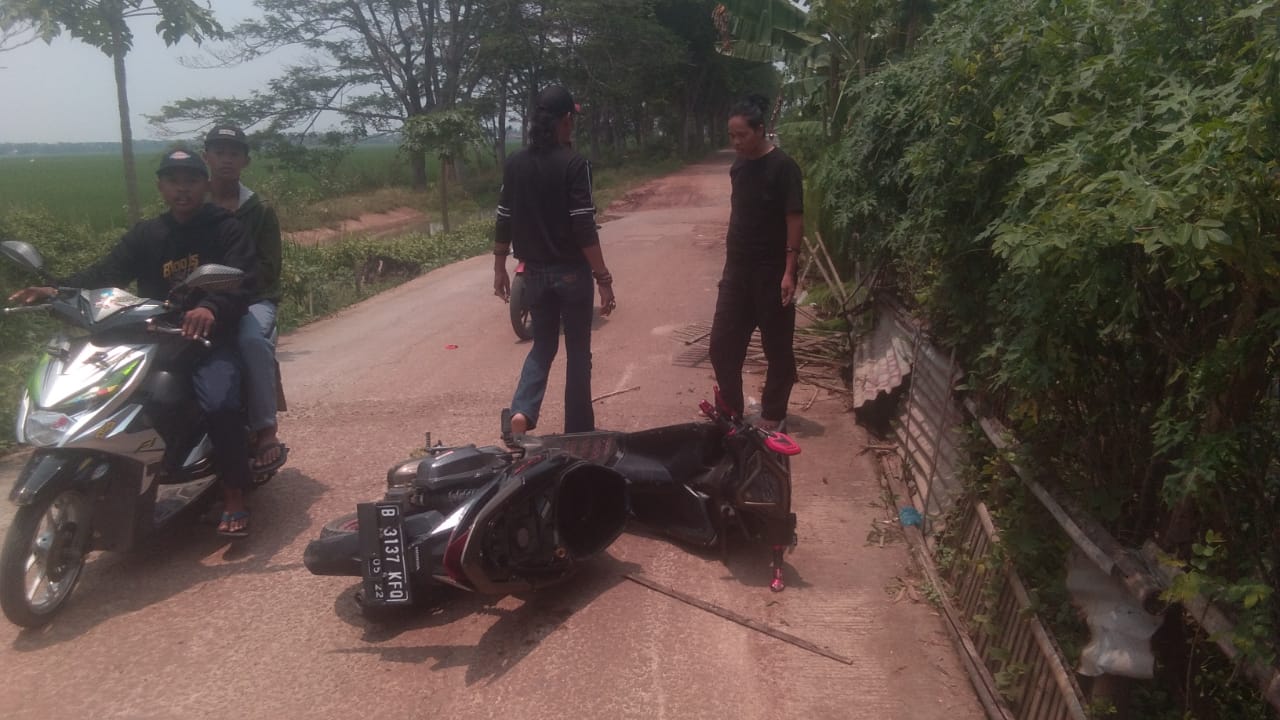NASIONALXPOS.CO.ID, BEKASI – Jalan pisangan arah ke Pulo pipisan, Desa Karangpatri Kecamatan Pebayuran, bukan yang pertama kali terjadinya kecelakaan, akibat rusaknya jalan yang cukup parah, sering mengakibatkan pengendara sepeda motor terjatuh di jalan pisangan pas gorong-gorong tersebut, kali ini kecelakan tunggal baru saja terjadi pada pengendara yang hendak pulang sekolah, kamis (21/10/2021).