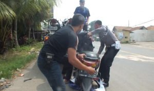 Dibantu rekannya Bripka Andi menaikan 3 unit kendaraan matic yang terlibat Laka Lantas.