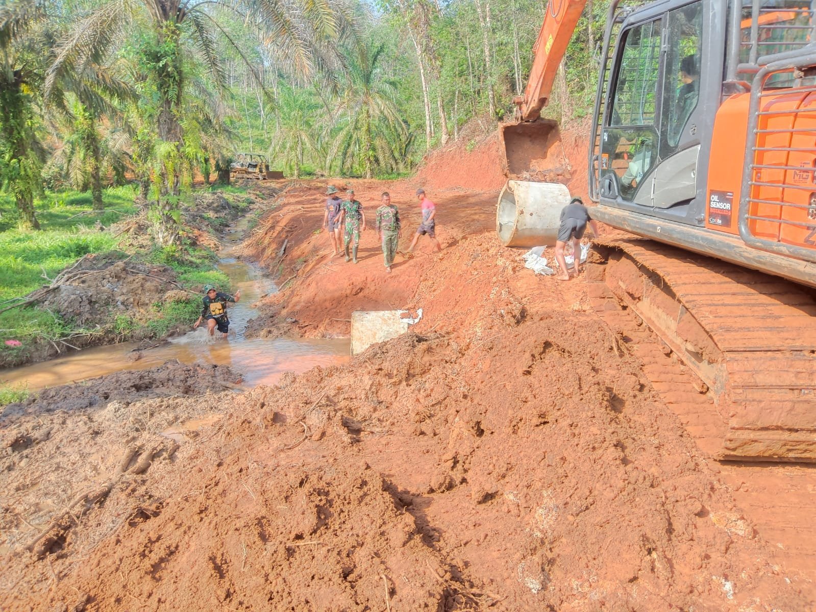 Personil satgas TMMD dan masyarakat terlihat mandi lumpur saat memasang gorong-gorong yang nantinya akan menghubungkan saluran air ke gorong-gorong berikutnya, sehingga saluran air pertanian tidak menghambat akses jalan.