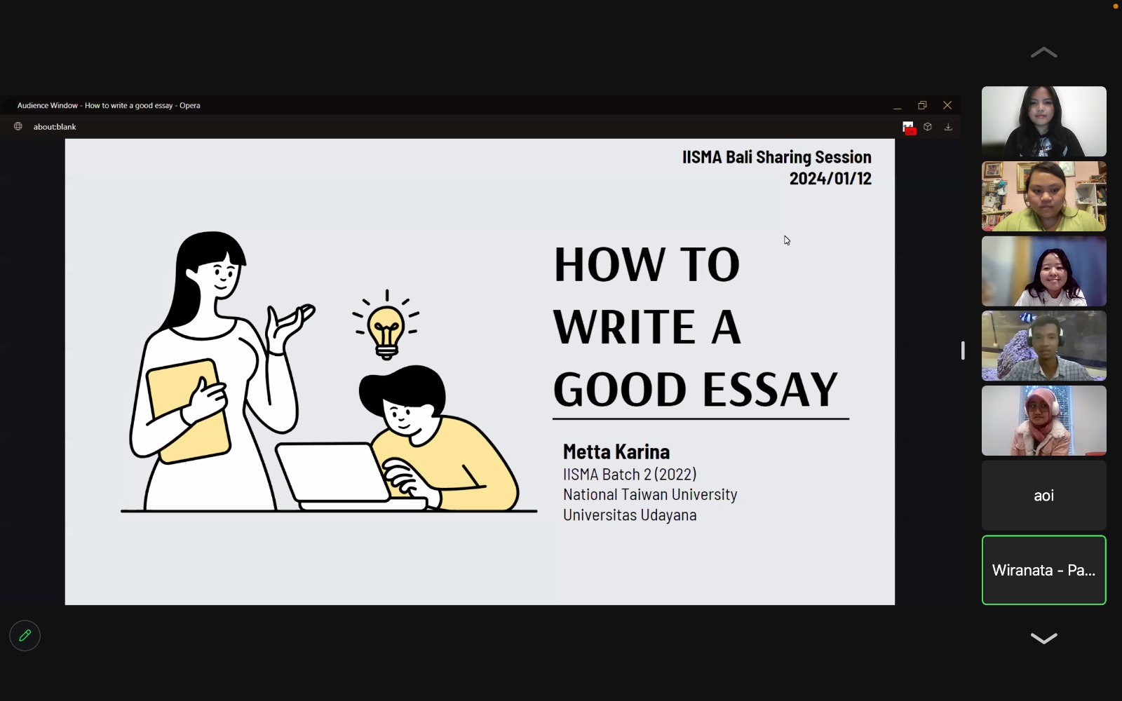 NASIONALXPOS.CO.ID, DENPASAR —Target peningkatan jumlah awardees IISMA Universitas Udayana di tahun 2024 mendorong Kantor Urusan Internasional (KUI) Unud menggelar berbagai sosialisasi termasuk sosialisasi ke tiap fakultas di Unud yang telah dilaksanakan akhir tahun 2023 lalu. Untuk lebih memantapkan persiapan mahasiswa Unud berkompetisi di ajang IISMA 2024, KUI Unud kembali menggelar sosialisasi yang lebih fokus untuk persiapan EPT dan Mentoring. Kali ini KUI menggandeng SUN Education Group dalam pemaparan materi sesi sharing bertajuk “IELTS Recipe: Study hacks for University Seekers” secara daring melalui Zoom Meeting pada Jumat (12/01/2024) sedangkan pada malam harinya volunteer awardees IISMA Unud tahun 2021-2023 mengadakan acara Sesi Mentoring bagi para pejuang IISMA.