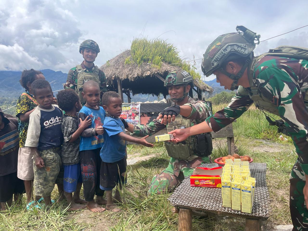NASIONALXPOS.CO.ID, PAPUA – Peduli dengan tumbuh kembang anak-anak, Satgas Mobile Yonif 323/BP melalui Pos Sinak Bandara membagikan susu dan telur kepada anak-anak Kampung Gigobak, Distrik Sinak, Kabupaten Puncak, Papua, Senin (10/06/2024)