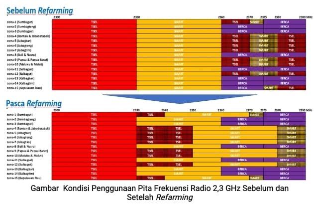 Kebijakan refarming tersebut bersifat mengikat dan akan dilaksanakan oleh seluruh operator telekomunikasi yang menjadi pemegang IPFR pada pita frekuensi radio 2,3 GHz yang terdiri dari 2 (dua) penyelenggara jaringan bergerak seluler yaitu TSEL dan SMART, serta penyelenggara jaringan tetap lokal berbasis packet switched yaitu BERCA.