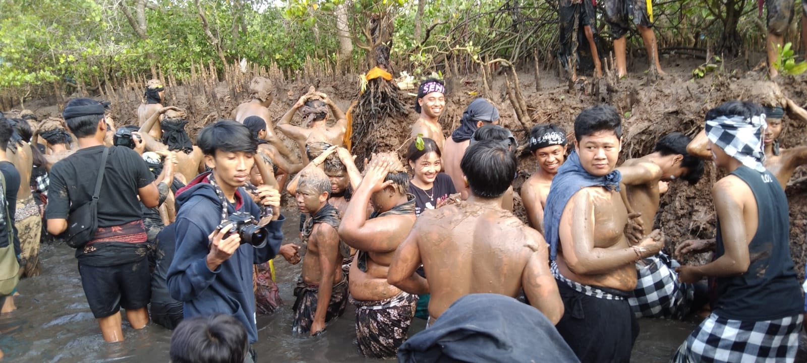 Sampai di lokasi hutan mangrove, Krama banjar terlebih dahulu dipercikan Tirta (air suci) dan lanjut berjalan kaki ketengah menyusuri hutan mangrove menuju lokasi Mebuugbugan. Sampai di lokasi merekapun langsung melumuri tubuh dengan lumpur. Sorak gembira para Krama Banjar memecah keheningan hutan mangrove. Usai melumuri badan dengan lumpur, mereka pun kembali berjalan kaki menuju segare (pantai).
