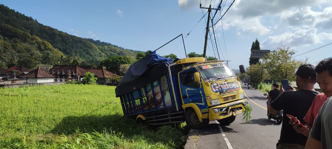 NASIONALXPOS.CO.ID, KARANGASEM – Truk bermuatan batu alam nyungsep ke sawah. Kejadian ini terjadi di banjar dinas kangkaang, desa kerthamandala, abang, karangasem. Kamis, (30/06/2022) pukul 09.25 wita.