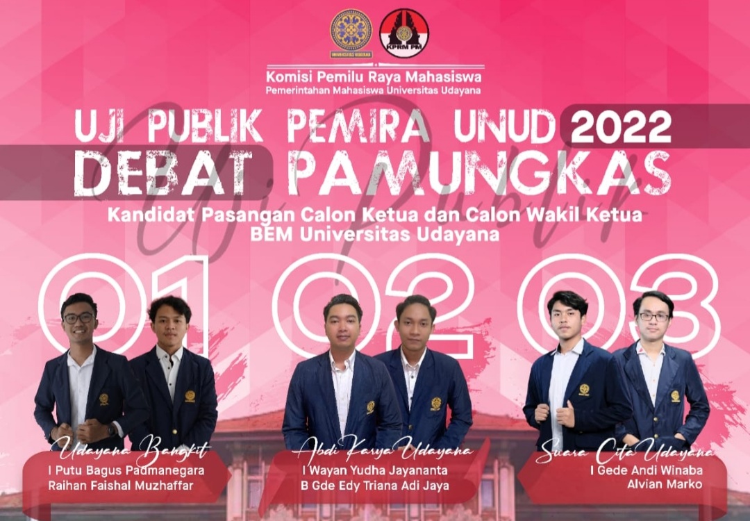 Pelaksanaan uji publik kali ini, ketiga calon presiden BEM Universitas Udayana, bersama wakilnya masing-masing hadir dalam uji publik pemira Unud 2022 debat terakhir itu dengan memberikan nuansa baru tata cara pelaksanaan berdemokrasi dalam debat publik yang positif dan saling mengutarakan visi serta misi setiap kandidat presiden beserta wakil presiden BEM.