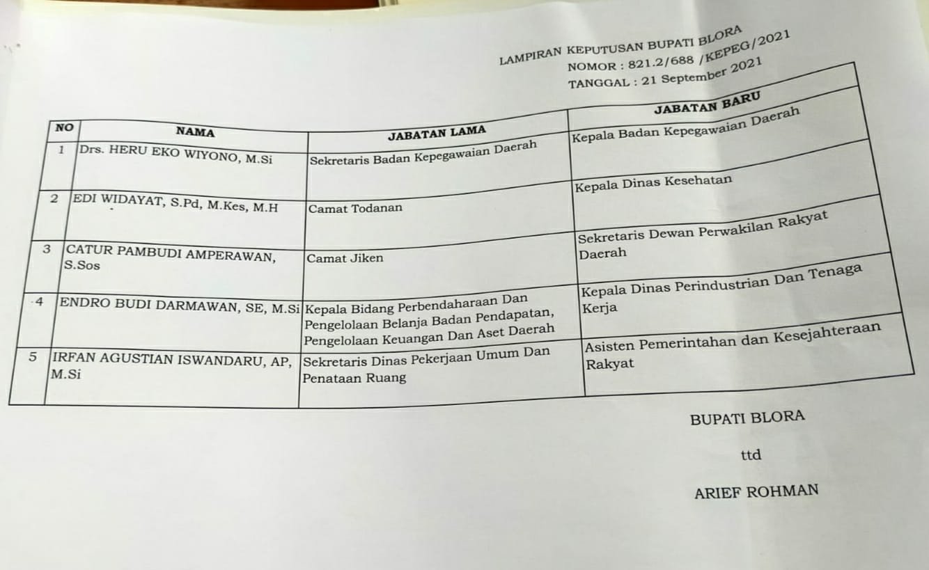 1.Edi Widayat sebagai Kepala Dinas Kesehatan (DKK) Blora, yang sebelumnya menjabat sebagai Camat Todanan.