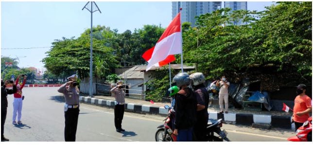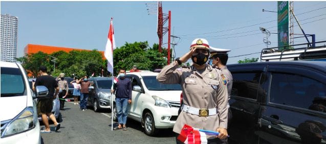 NASIONALXPOS.CO.ID, SURABAYA – Guna menghormati jasa para pejuang pahlawan kemerdekaan Republik Indonesia. Tepat pukul 10.17 WIB, para pengendara yang melintas di Jalan Ahmad Yani, Surabaya, atau kawasan Bundaran Taman Pelangi, dihentikan oleh anggota kepolisian dengan membagikan bendera merah putih, dan menyanyikan lagu Indonesia Raya, Selasa (17/8/2021).