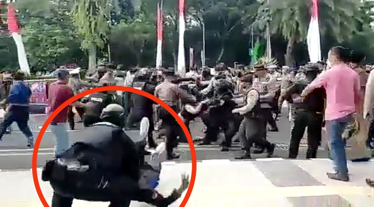 Dari rekaman video viral di media sosial berdurasi 48 detik memperlihatkan seorang mahasiswa dibekuk aparat kepolisian berseragam hitam. Mahasiswa yang dicekik kemudian langsung dibanting hingga pingsan.