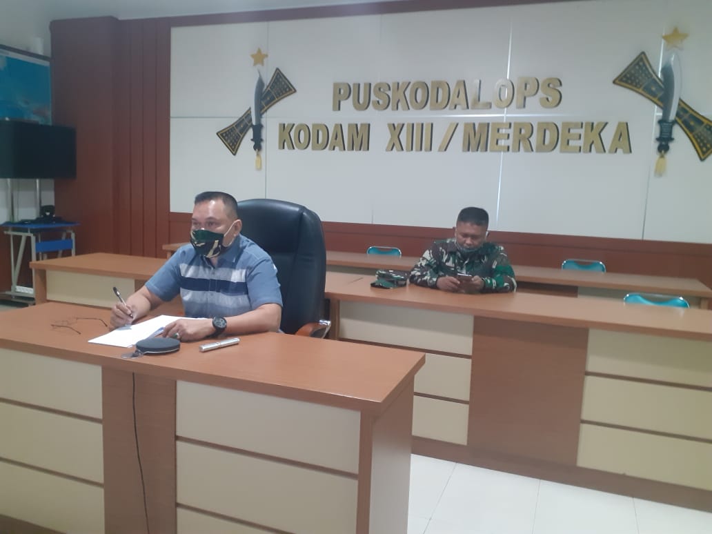NASIONAL XPOS.CO.ID MANADO -Pendam XIII/Merdeka, Wakil Kepala Pendam XIII/Merdeka Letkol Inf Rocky Philip Kiroh mengikuti Video Conference bersama Ketua Gugus Tugas Covid 19 Letnan Jenderal TNI Donny Munardo bertempat di Ruang Puskodalops Makodam XIII/Merdeka , Minggu (9/8/2020)