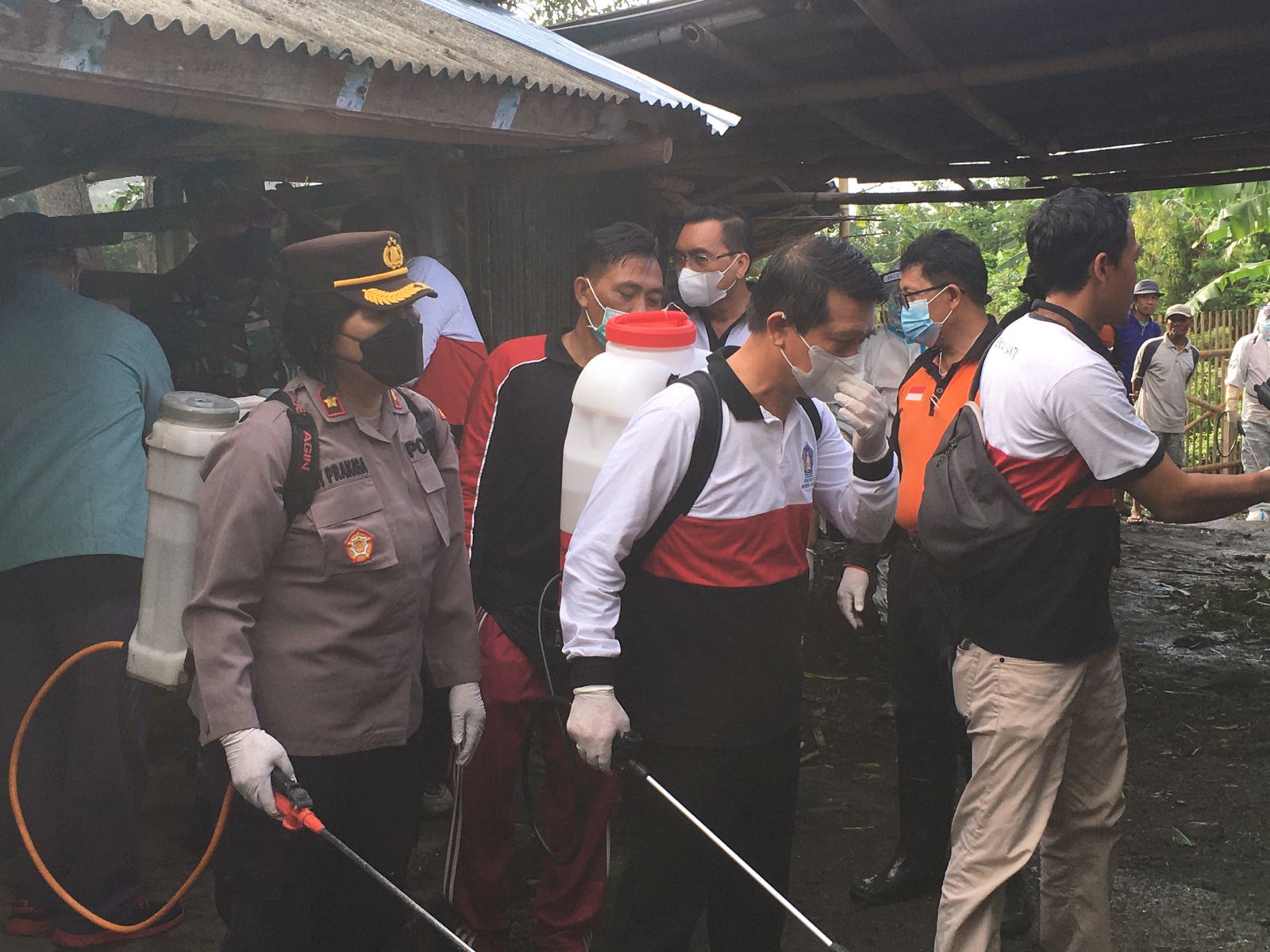 NASIONALXPOS.CO.ID, KLUNGKUNG – Untuk mengantisipasi penyebaran penyakit mulut dan kuku (PMK) pada hewan berkuku genap/belah di Wilayah Klungkung, Bupati Klungkung I Nyoman Suwirta S.Pd.M.M., Wakapolres Klungkung Kompol Luh Ketut Amy Ramayathi Prakasa S.I.P.,M.M., Kasdim 1610/Klungkung Mayor Kav. I Nyoman Arya Jayantara, Sekda Kab Klungkung Gede Putu Winastra, dan Kepala Pelaksana BPBD Klungkung Putu Widiada melakukan Penyemprotan dengan cairan disinfektan di kandang sapi milik kelompok ternak sapi Simantri Darma Winangun Desa Tangkas. Rabu, (06-07-2022).