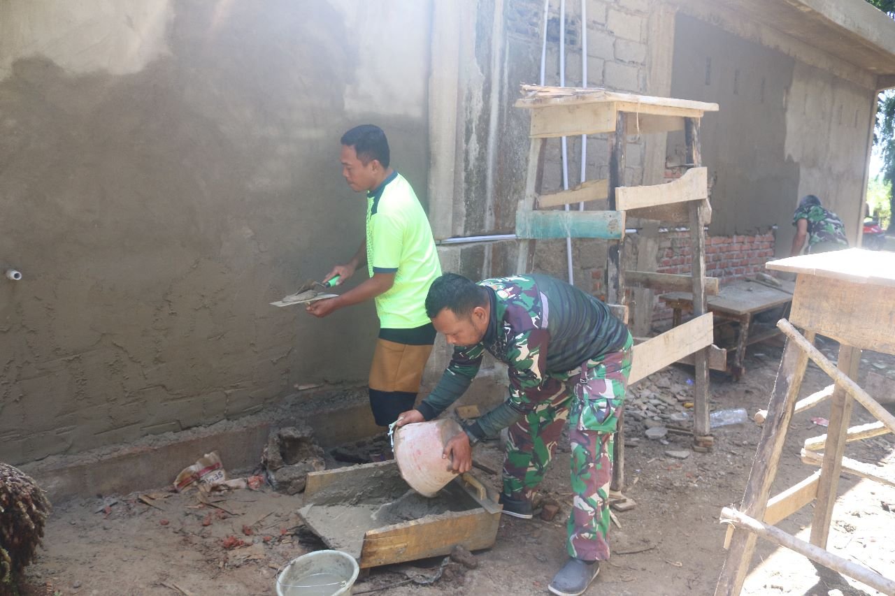 Dijelaskan dia, penambahan semen untuk menghaluskan dinding, dalam bahasa sehari-hari disebut acian, dikerjakan dengan kompak oleh masyarakat bersama Satgas TMMD.