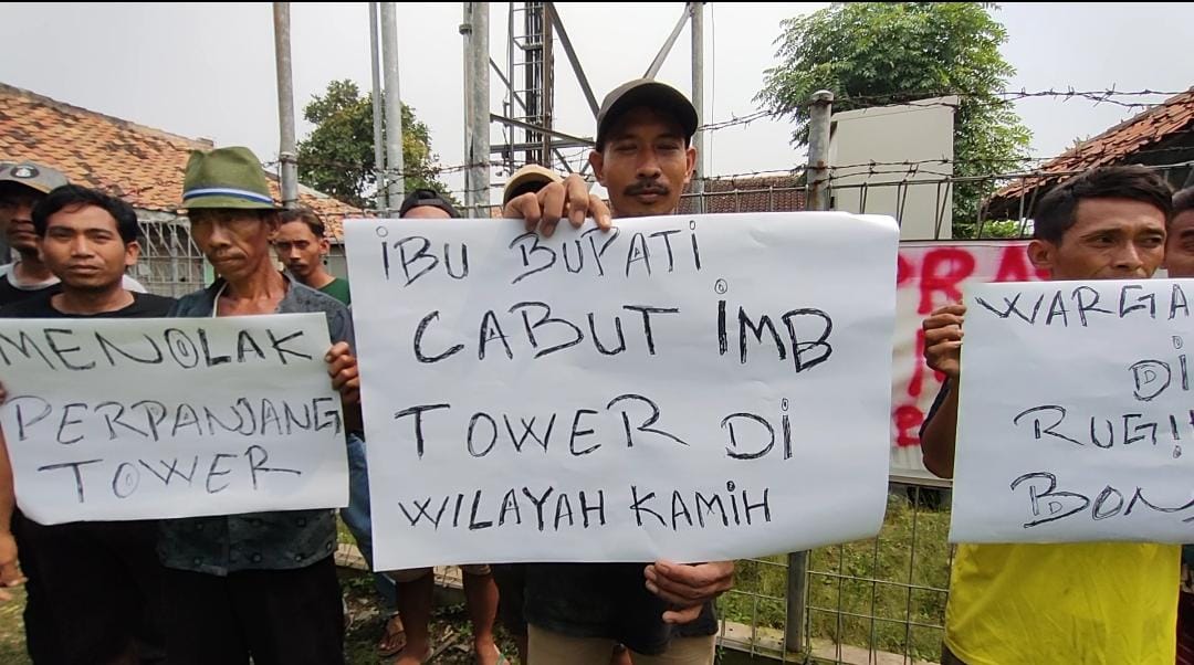 Tower telekomunikasi yang berdiri sejak tahun 2012 di lahan permukiman warga ini warga membawa spanduk bertuliskan penolakan perpanjangan tower.