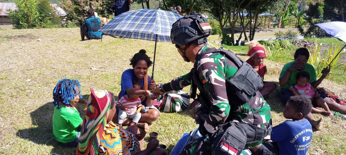 Pelaksanaan Bakar Batu yang bertempat di Gereja Gidi Wadenggobak Distrik Irimuli, Danposramil Kalisemen alias Kepala Tikus Prajurit Yonif R 712/Wiratama yang bersemboyankan “Pemenoungen Ne Tou Umbanua yang berarti Berani berkorban demi kepentingan rakyat dan Negara”,