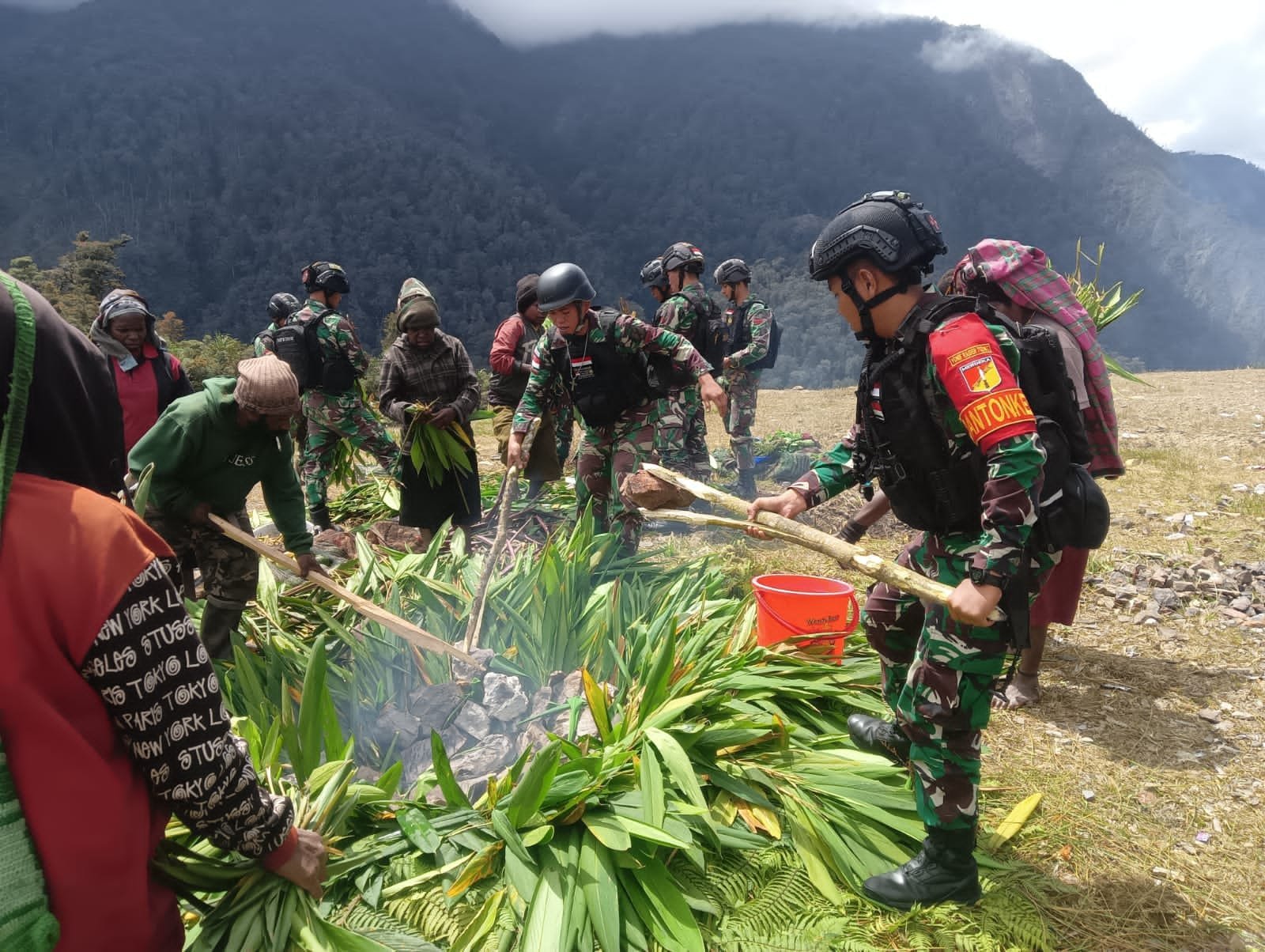 NASIONALXPOS.CO.ID.PAPUA,-Prajurit TNI Kodam XIII/Merdeka dari Satuan Satgas Organik Yonif R 712/Wiratama yang baru saja tiba di lokasi penugasannya, diantaranya Posramil Kalisemen, Posramil Kotabaru, Posramil Puncak Senyum, Posramil Kalome dan Posramil Nume diundang warga setempat untuk ikut serta dalam tradisi Bakar Batu atau Barbeque ala masyarakat Papua, yang digelar warga setempat dalam rangka menyambut Natal 2022 dan Tahun Baru 2023 di Kabupaten Puncak Jaya, Jumat (23/12/2022).