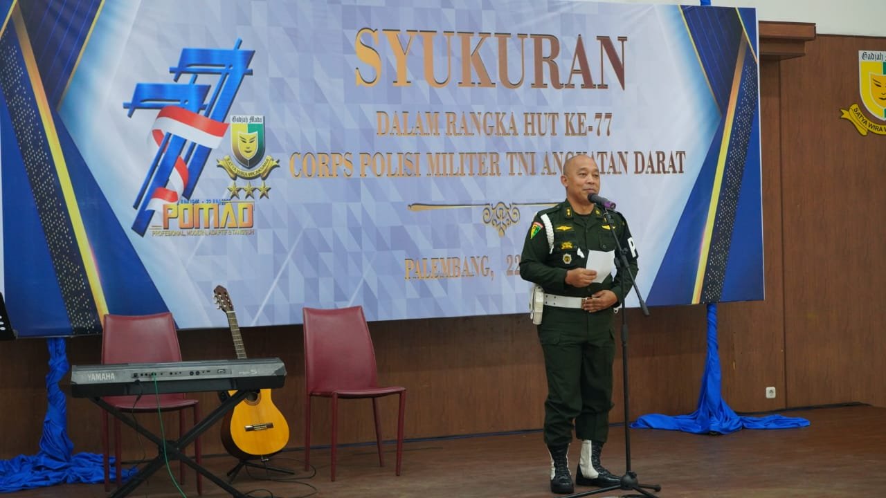 Dalam sambutannya, Danpomdam II/Sriwijaya Kolonel Cpm Dr. AzmilUmur, S.H., M.H, yang dibacakan Wadanpomdam II/Sriwijaya Letkol Cpm John Charles B.N Sitorus, S.E, S.H, M.Tr (Han) mengatakan, momentum kegiatan syukuran ini sebagai