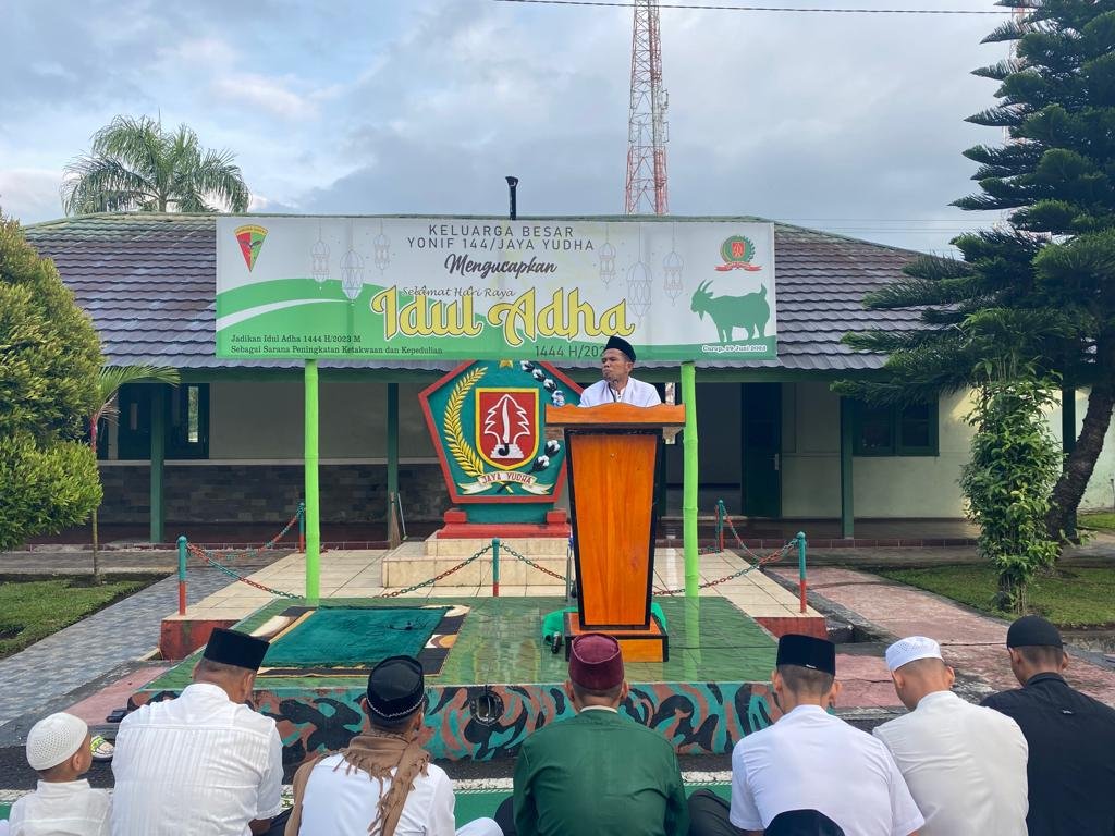 NASIONALXPOS.CO.ID, BENGKULU – Danyonif 144/JY Letkol Inf Eko Budiarto, S.I.P.,M.I.P, beserta seluruh Prajurit, Persit dan warga sekitar menggelar Sholat Idul Adha 1444 H/2023 M, di lapangan Makoyonif 144/JY, Kamis (29/6/2023).